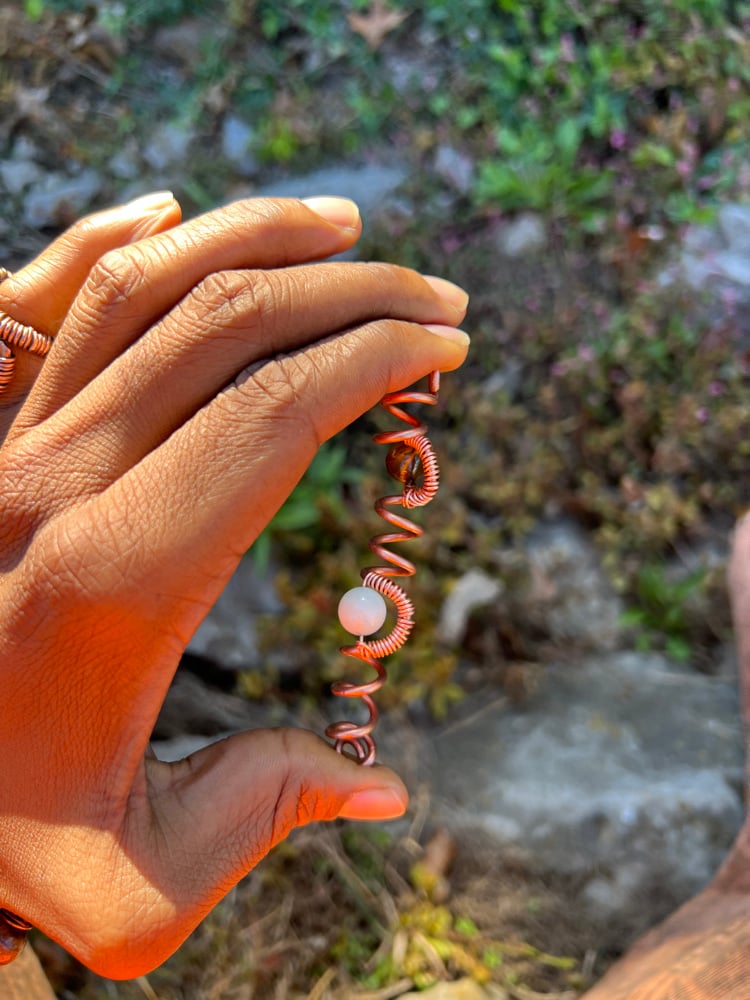 an attachment for the most sacred antennae. sculpted from ether. infused with copper and crystal prisms. adornments for the locs and braids of the indigenous..