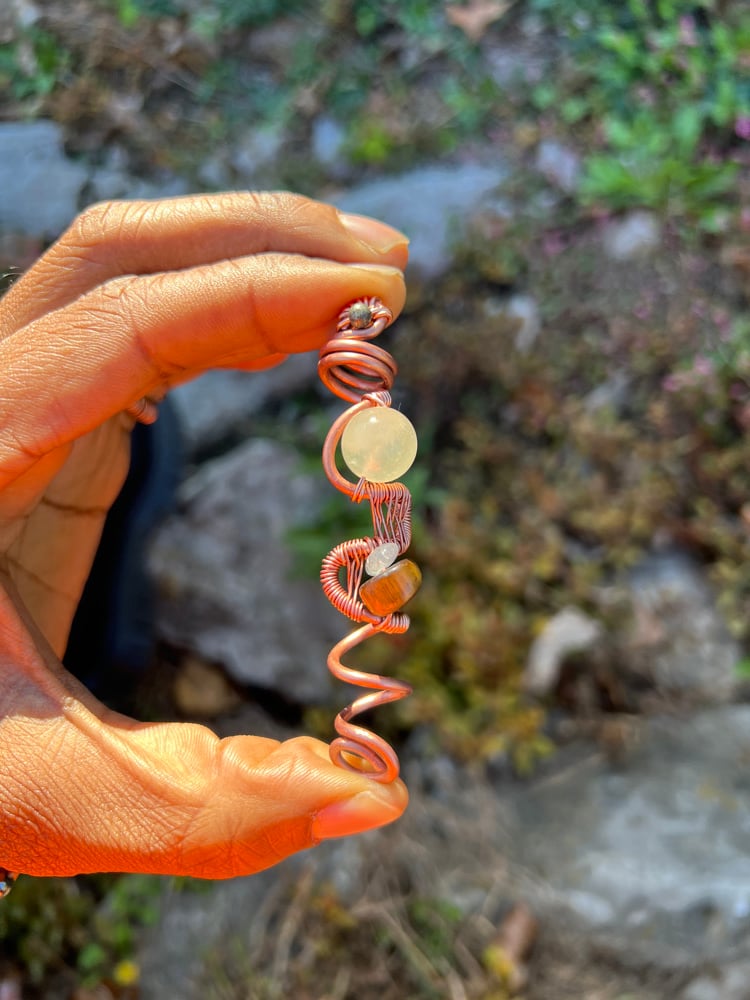 an attachment for the most sacred antennae. sculpted from ether. infused with copper and crystal prisms. adornments for the locs and braids of the indigenous.